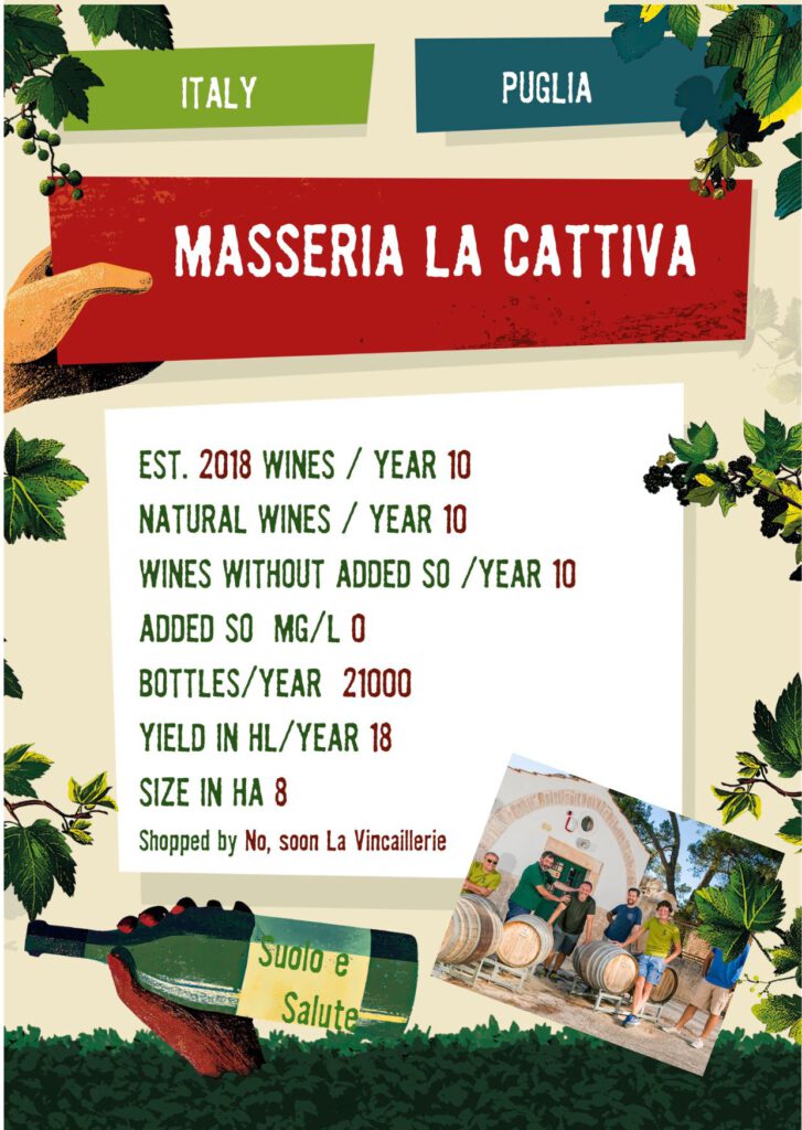 La Cattiva is a story of defense, enhancement, return and restart. The defense of Apulia’s indigenous vineyards. The Valorization of a historic masseria and a wonderful territory. The return to a sustainable agricultural model. The restart of our lives with a new challenge.